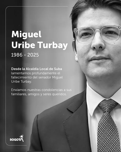 Desde la Alcaldía Local de Suba lamentamos profundamente el fallecimiento del senador Miguel Uribe Turbay, líder político y servidor público.