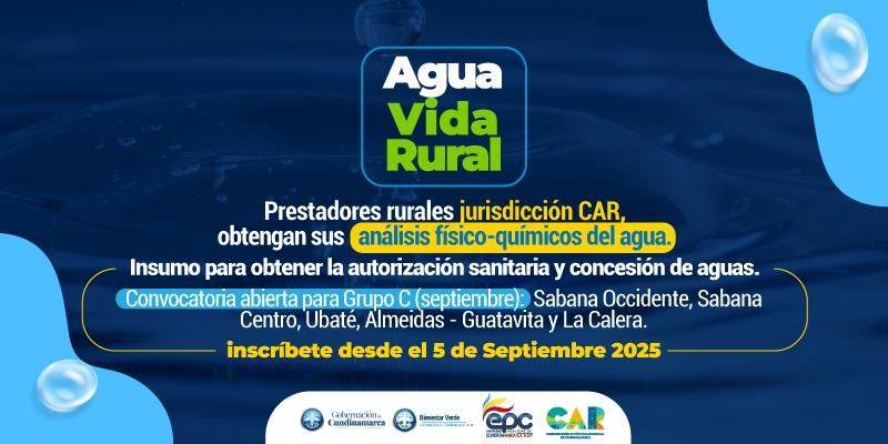 El programa Agua Vida Rural continúa extendiendo su alcance en Cundinamarca. Desde el 5hasta el 30 de septiembre de 2025 se encuentra abierta la convocatoria del Grupo C, dirigida a los prestadores de acueductos rurales de las provincias de Sabana Occidente, Sabana Centro, Ubaté, Almeidas, Guatavita y La Calera.